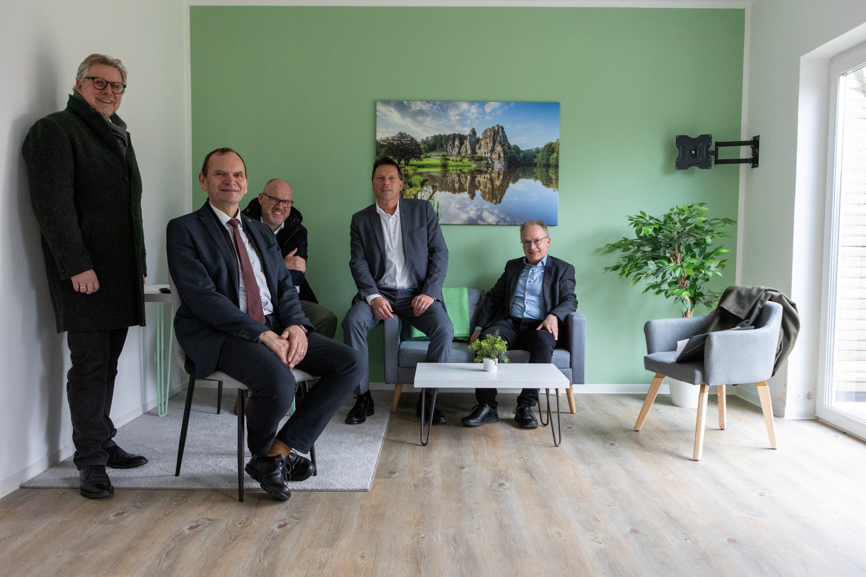 Zu Gast in der Musterwohnung für studentisches Wohnen an der Adenauerstraße: (von links) Detmolds technischer Beigeordneter Thomas Lammering, Prof. Dr. Jürgen Krahl, Präsident der Technischen Hochschule OWL, Genossenschaftsvorstand Michael Kirchner, Bürgermeister Frank Hilker und Genossenschaftsvorstand Daniel Klei, Abteilungsleiter Finanzen und Steuern der Stadt Detmold. (Foto: Stadt Detmold)