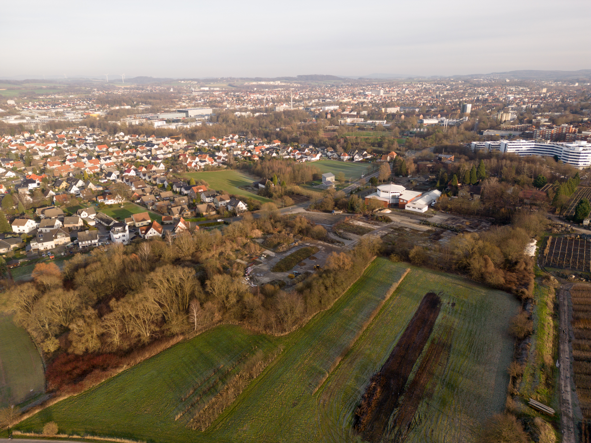 Das Foto zeigt das Gelände des ehemaligen Betonwerks Sander aus der Vogelperspektive. Hier beginnen in der ersten Septemberwoche die Erschließungsarbeiten für das neue nachhaltige Gewerbegebiet. Foto: Stadt Detmold