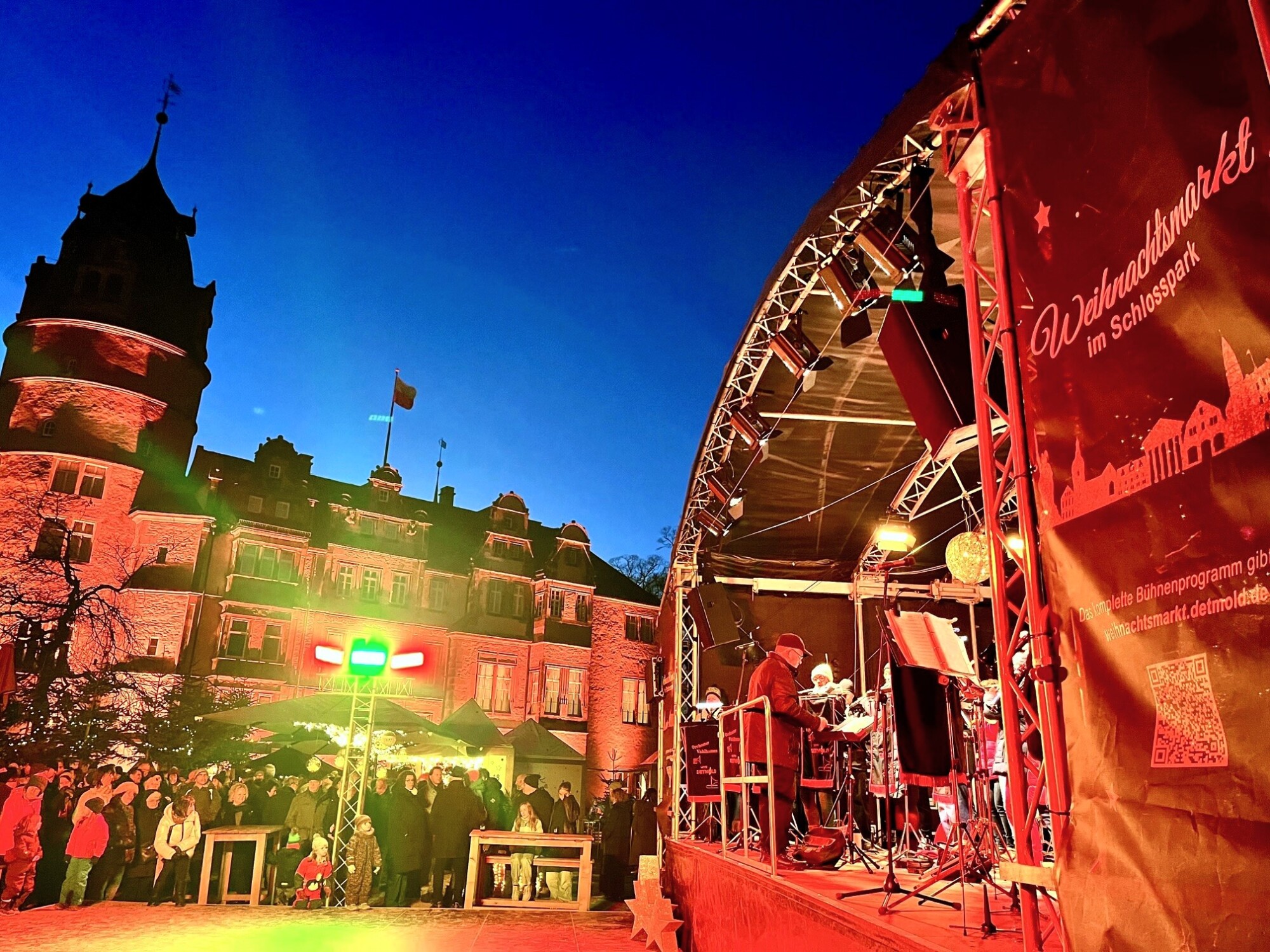 Vor der Kulisse des festlich illuminierten Schlosses fand vom 1. bis 30. Dezember der dritte Detmolder Weihnachtsmarkt statt. Mehr als 60 Veranstaltungen sorgten auf der Weihnachtsmarktbühne für beste Unterhaltung. Bild: Stadt Detmold