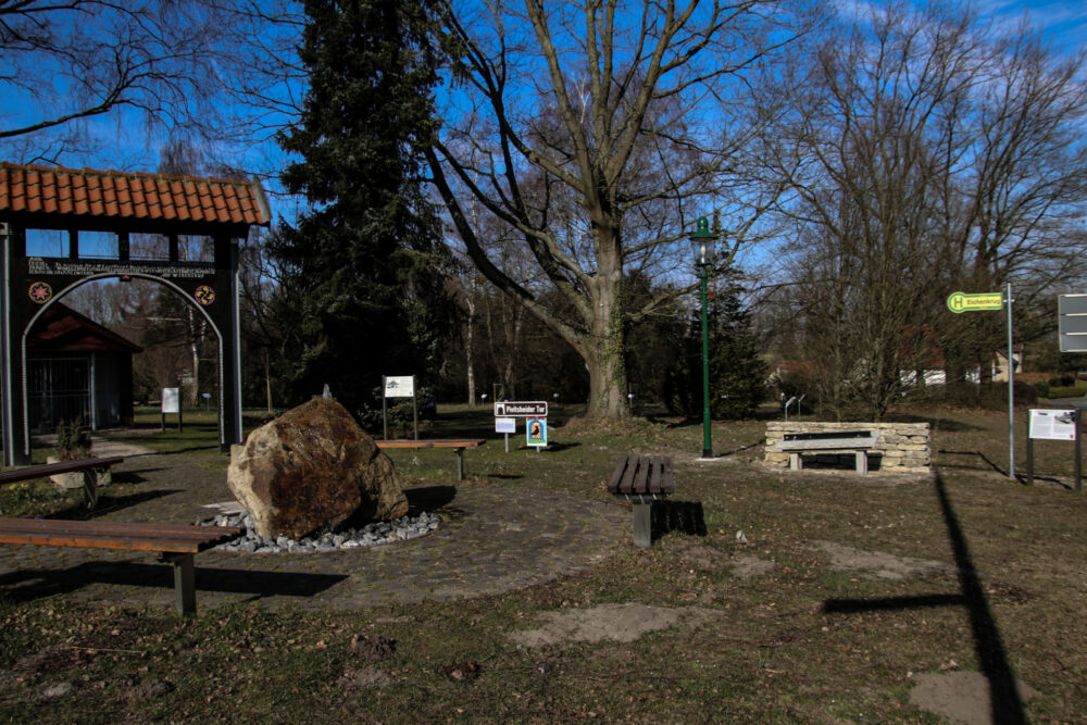 Das Insektenhotel „Zur wilden Biene“  bietet vielen Arten Unterschlupf, auch zur Vermehrung. Das „Glockendenkmal“ in der Mitte des Parks, erinnert an die ehemalige katholische Kirche hier im Ort. Nur mit großem Einsatz vieler  ehrenamtlicher Helfer und   spendabler Firmen, sowie finanzieller Unterstützung, durch Spenden von Bürger*innen, der Kirche, Geldinstituten aber auch Zuschüsse der öffentlichen Hand, konnten die drei Glocken erhalten werden.