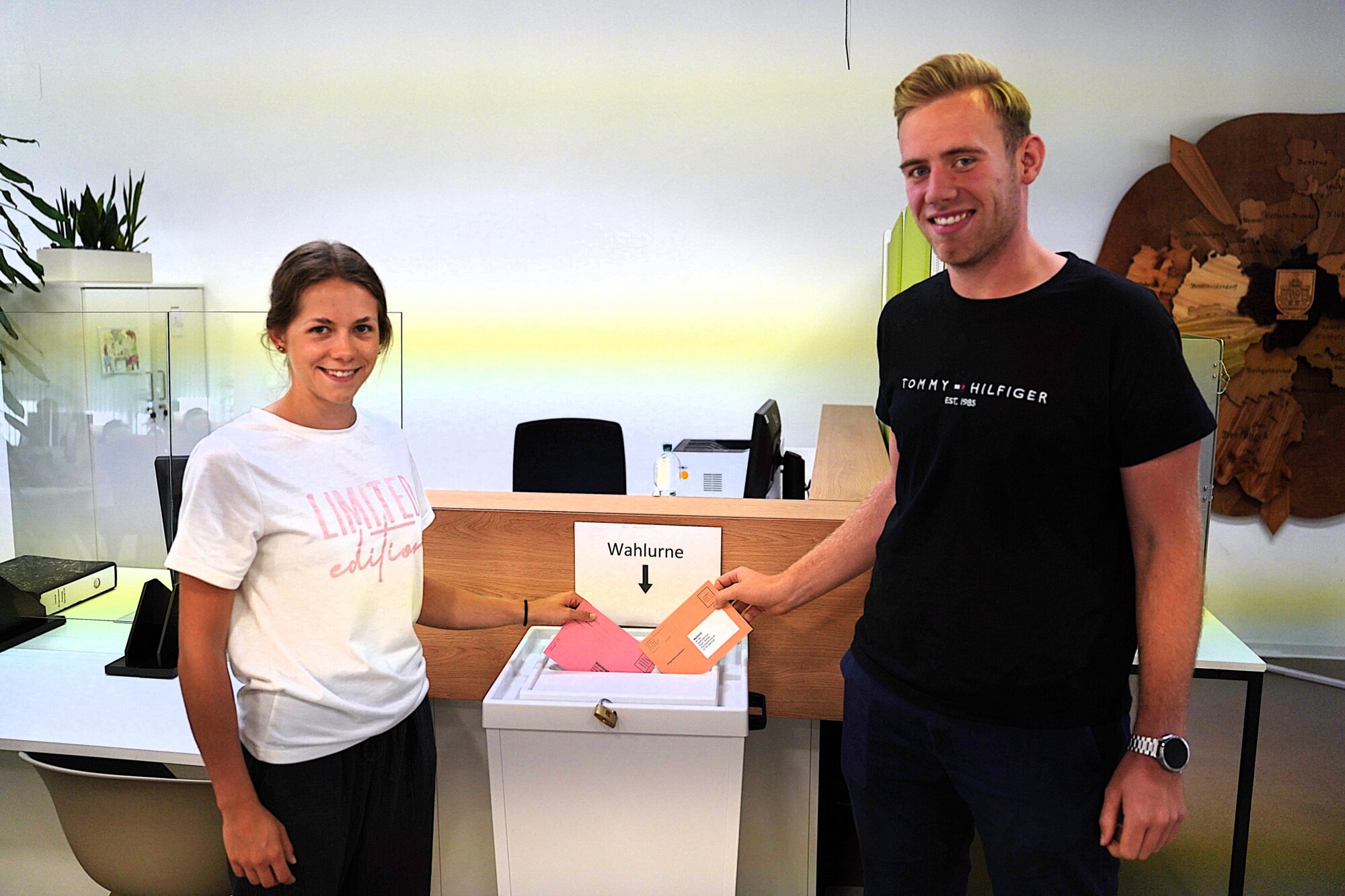 Lea-Maxime Heil (links) und Joel Adrian stehen für Bürgerinnen und Bürger im Briefwahlbüro  (Bürgerberatung, Paulinenstraße 45) bereit. Foto: Stadt Detmold