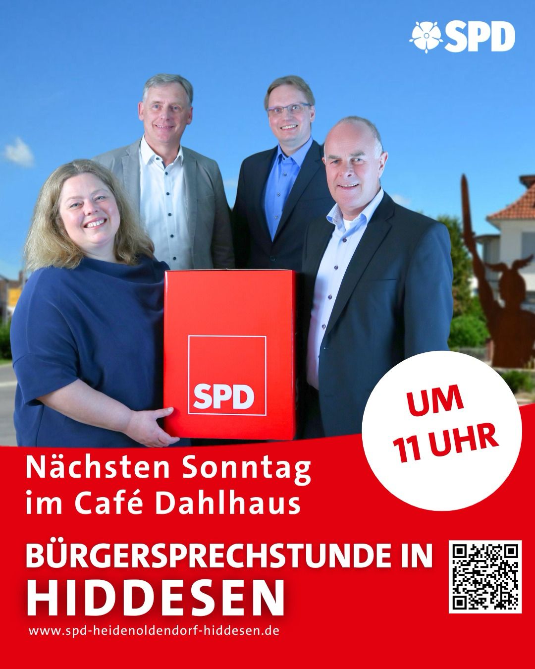 Unsere nächste Bürgersprechstunde in Hiddesen steht am Sonntag an. Mit dabei sind unsere Ratskandidaten Cord Brüning und Jörg Stiegmann, die Vorsitzende der SPD-Kreistagsfraktion Ilka Kottmann und der Landtagsabgeordnete dennis Maelzer Los geht es am 6. April um 11 Uhr bei Dahlhaus.