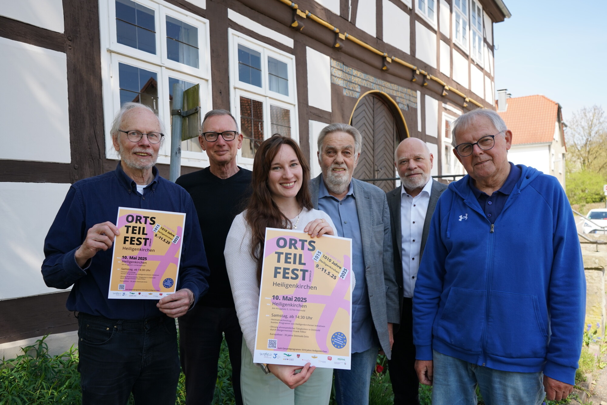 Freuen sich auf die Festlichkeiten zum 1010-jährigen Bestehen Heiligenkirchens und das Ortsteilfest am 10. Mai: (von links) Bernd Groeger und Joachim Kleinmanns vom Heimatverein, Nora Moos (Ehrenamtskoordinatorin der Stadt Detmold), Werner Zahn (Heimatverein), Ortsbürgermeister Rainer Friedrich und Heinz Heerde, ebenfalls vom Heiligenkirchener Heimatverein.    Foto: Stadt Detmold