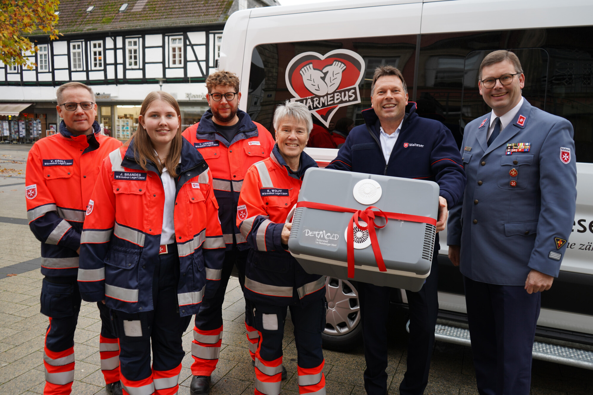Beim Besuch des Wärmebusses heute Nachmittag auf dem Detmolder Marktplatz hat Frank Hilker einen Blick ins Innere des Fahrzeugs geworfen und den Verantwortlichen als Geschenk für die Erstausstattung eine Thermobox überreicht, in der die benötigten Lebensmittel künftig fachgerecht transportiert werden können. Ende November wird das Fahrzeug im Beisein des Schirmherrn feierlich gesegnet.