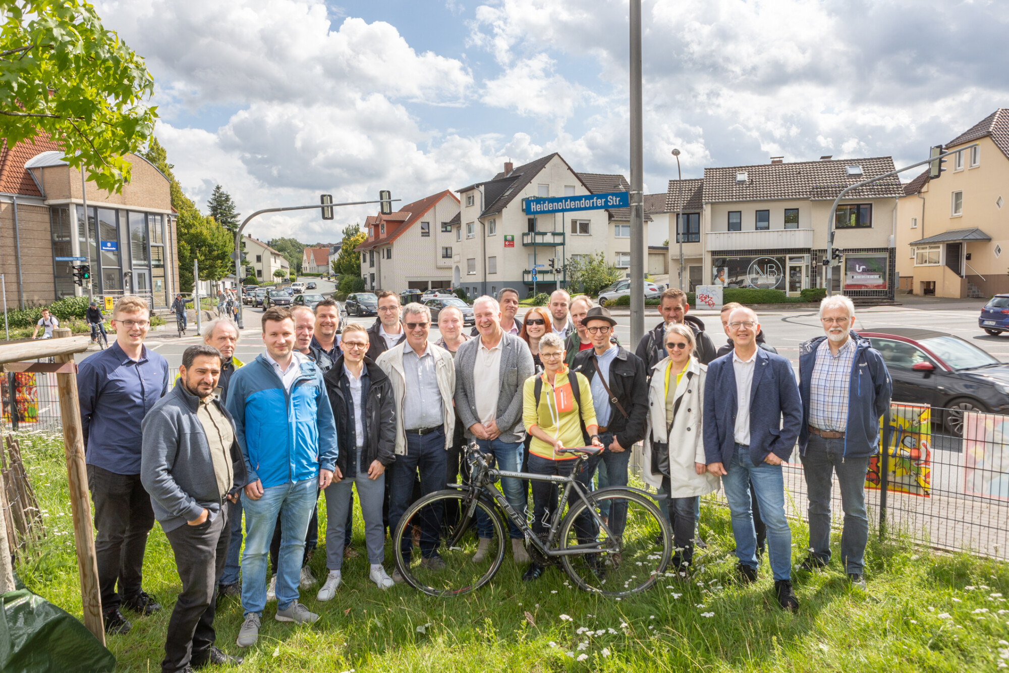 Vorzeigeprojekt in Detmold: Die Veloroute West zieht Verkehrsplaner bei den Bezirksregierungen aus ganz NRW und dem Verkehrsministerium NRW in ihren Bann, insbesondere die innovative Kreuzung Heidenoldendorfer Straße / Hiddeser Straße, die die Stadt Detmold erfolgreich mit einer Diagonalquerung für Radfahrer umgestaltet hat. Experten und Expertinnen aus ganz NRW sind zum Ortstermin gekommen.