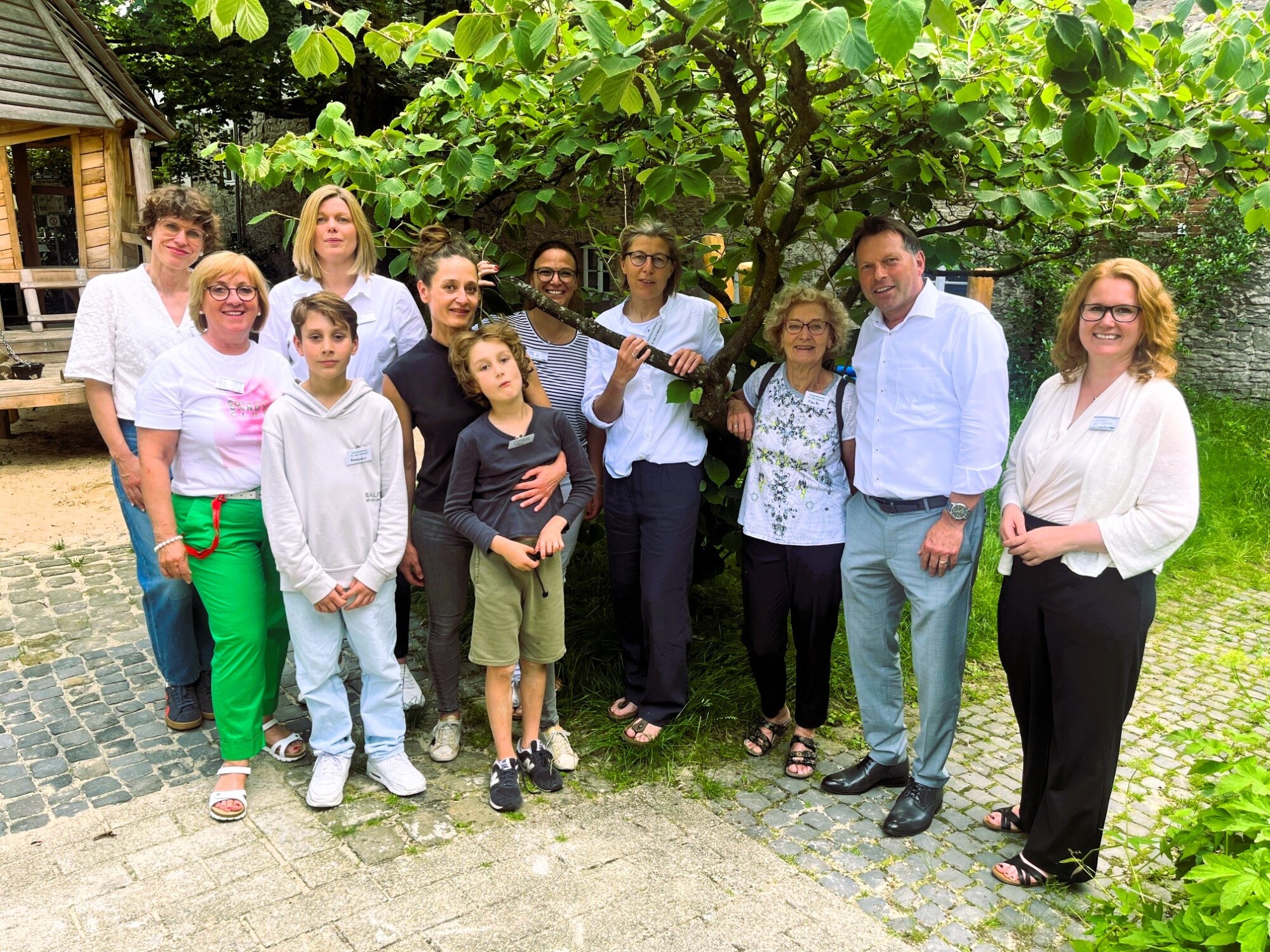 Bürgermeister Frank Hilker (2.v.r) und Jennifer Sonneborn (rechts), Leiterin des Fachbereichs für Jugend, Schule und Sport, freuen sich darüber, dass die Stadt Detmold das Angebot der Familienlotsin nun verstetigt. Zu einem Austausch trafen sie sich mit (von links) Joanna Stöcker, Ulrike Räker und Esther Rosenbrock (Fachbereich Jugend, Schule und Sport), Dr. med. Jessica Gawenda (Gynäkologin) und ihren Söhnen Konstantin und Theo, Familienlotsin Friederike Müller und Dr. Natalie Hellermann (Kinderärztin). Ebenfalls zu Gast war Monika Dreise (3.v.r., Mutter von Dr med. Gawenda). Foto: Stadt Detmold