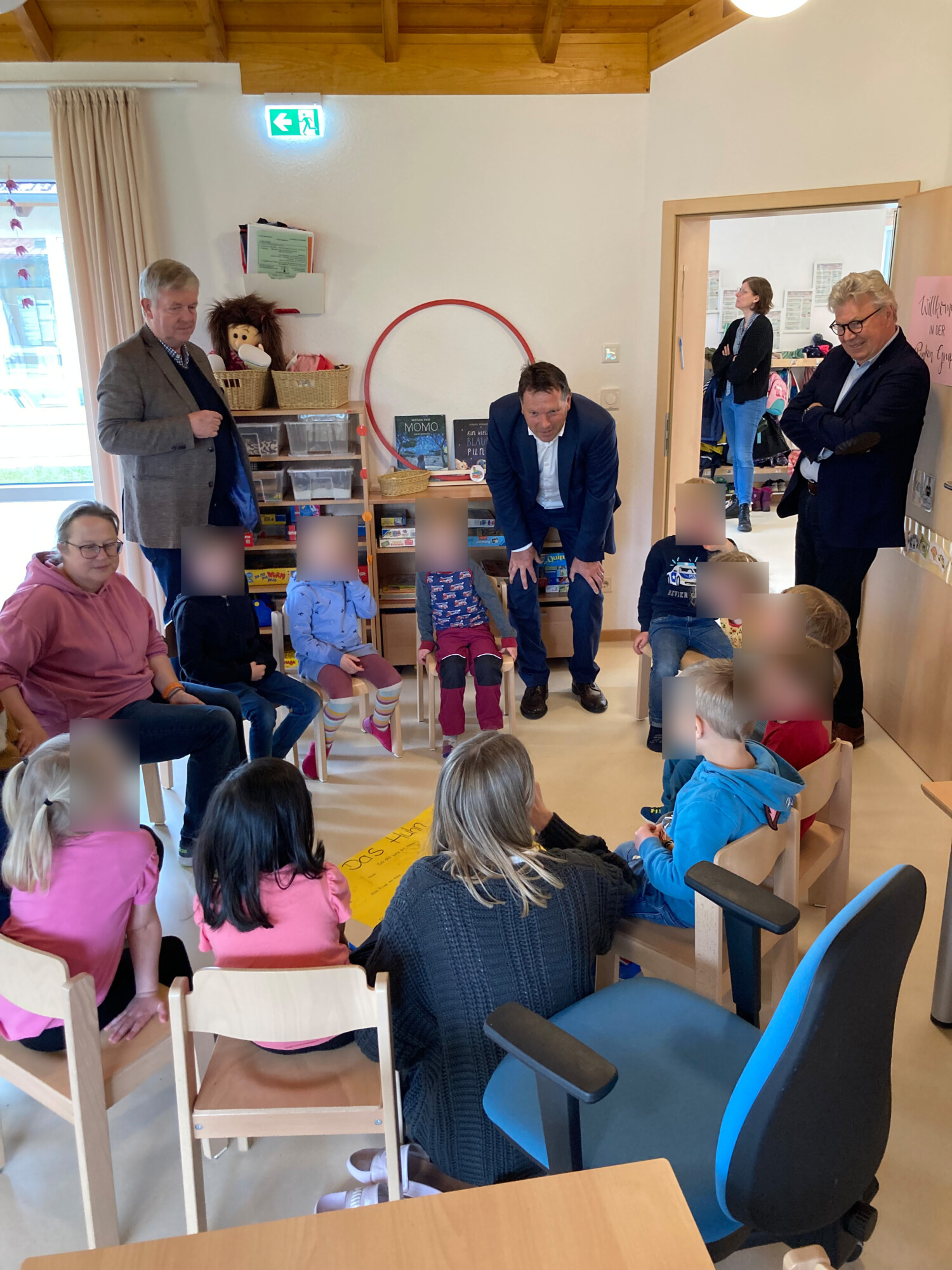 Besuch in einer der Gruppen des Familienzentrums Vahlhausen mit (von links): Manfred Klocke, Vorsitzender des Vereins für Körper- und Mehrfachbehinderte im Kreis Lippe e. V., Bürgermeister Frank Hilker und Helmut Merwitz (Vorstandsmitglied des Vereins). Im Hintergrund Vorstandsmitglied Marion Breuch. Foto: Stadt Detmold