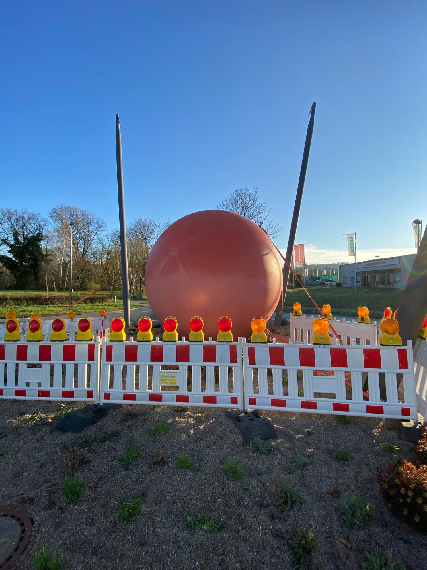 Die umgehend alarmierte Feuerwehr und ein Team des städtischen Bauhofs konnten die Situation schnell absichern. Mit Hilfe eines hinzugezogenen Krans wurde die Kugel angehoben und vollständig aus der verbliebenen Befestigung gelöst. Sie liegt nun auf dem Boden in der Mitte des Kreisverkehrs und ist so festgegurtet, dass sie sich nicht von der Stelle bewegen kann. Absperrbarken ringsherum sorgen für zusätzliche Sicherheit am Kreisverkehr, der nach vorübergehender Sperrung schon seit gestern Abend wieder für den Verkehr freigegeben ist. Zur weiteren Absicherung wird heute ein Bauzaun um die Kugel herum aufgestellt.