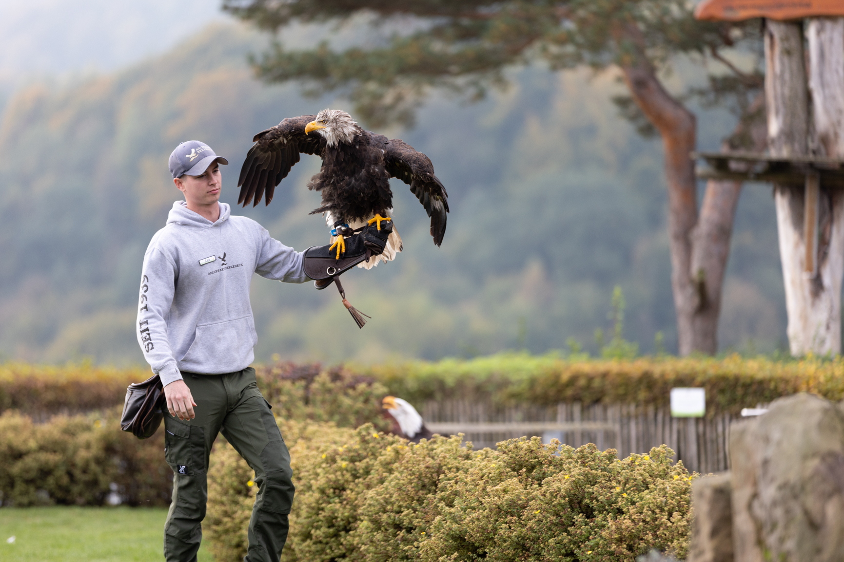 Derzeit finden die beliebten Flugshows der Adlerwarte (täglich um 11 Uhr und 15 Uhr) mitten auf dem Gelände, im Bereich der Trainingswiese von Weißkopfseeadler „Donald“ und seinen gefiederten Freunden, statt. Der Grund: Die Tribüne wird repariert, nachdem bei Wartungsarbeiten Probleme festgestellt wurden.