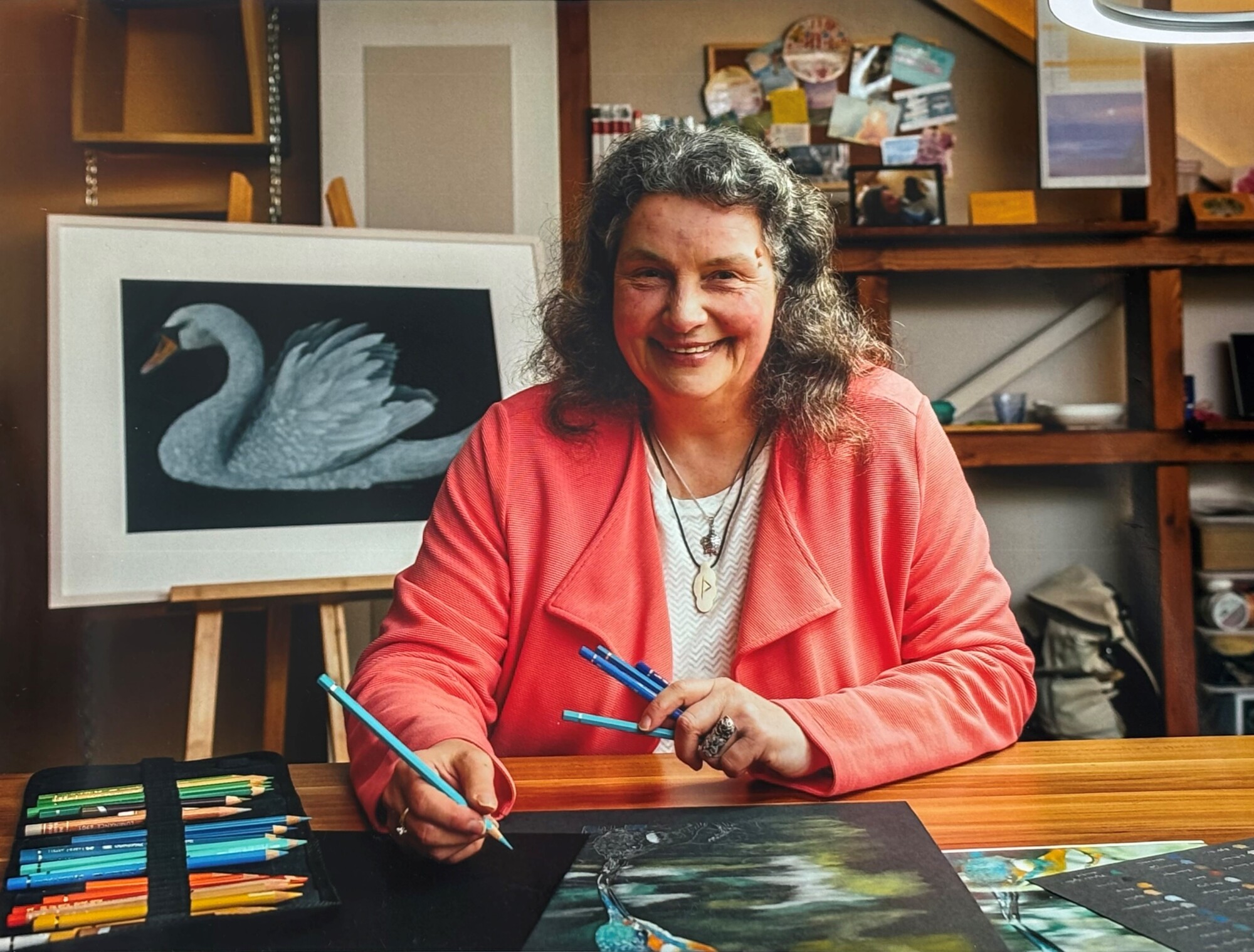 Claesberg, die sich auf naturgetreue Darstellungen von Greifvögeln und Wildtieren spezialisiert hat, arbeitet ausschließlich mit colored pencils, also Buntstiften. Das Ergebnis sind verblüffend realistische Tierporträts, bei denen jede einzelne Feder und jedes Fellhaar erkennbar scheint.