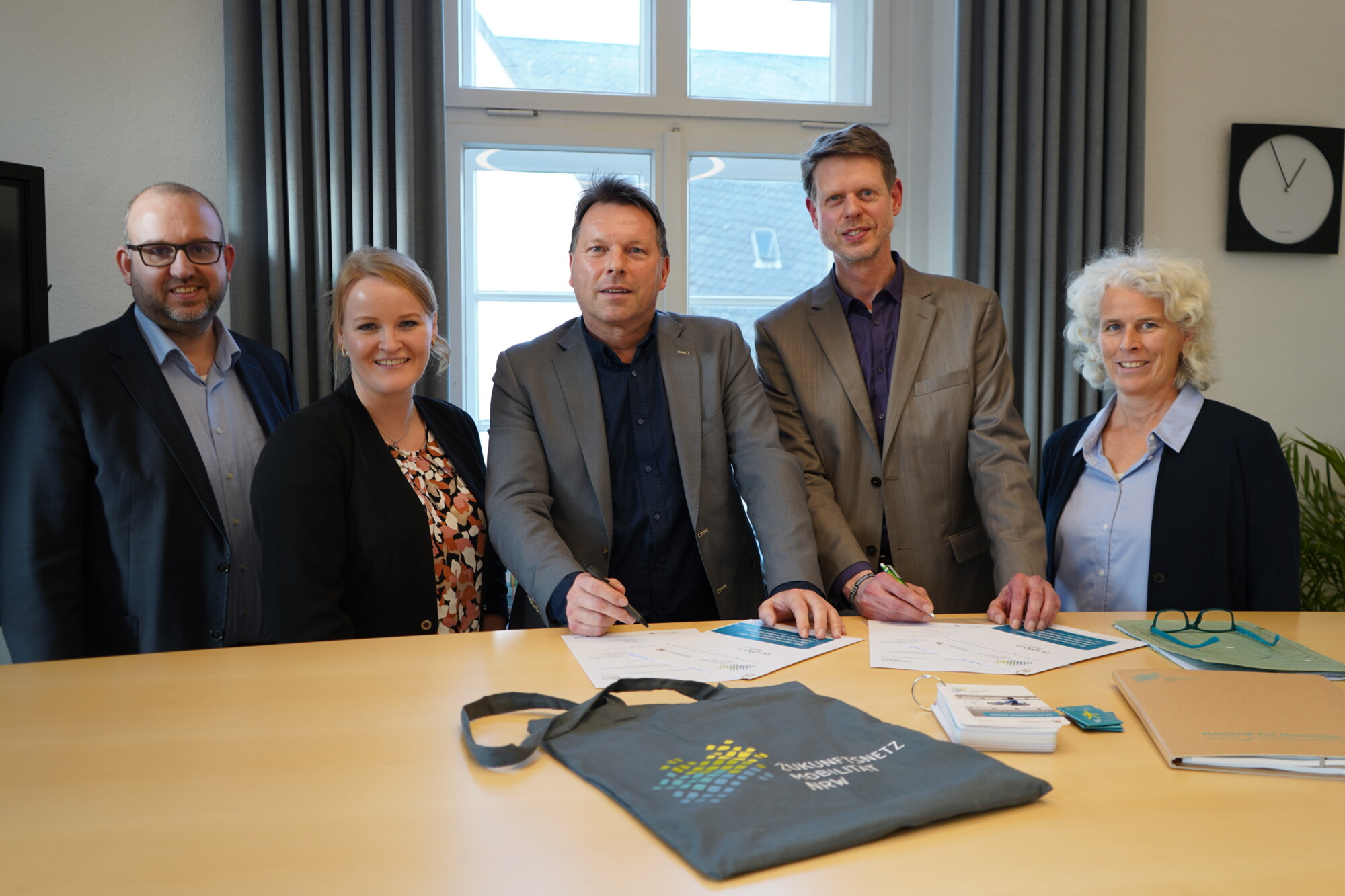 Verlängerung der Rahmenvereinbarung im Detmolder Rathaus: Seit 2017 ist die Stadt Detmold Mitglied im Zukunftsnetz Mobilität NRW. Das Foto zeigt (von links) Martin Kölczer (Fachbereichsleiter Stadtentwicklung bei der Stadt Detmold), Linda Waldeyer (Zukunftsnetz Mobilität NRW), Detmolds Bürgermeister Frank Hilker, Marcus Heidebrecht (Zukunftsnetz Mobilität NRW) und Petra Rehling (Teamleiterin Verkehrsplanung und Mobilitätsmanagement bei der Stadt Detmold). Foto: Stadt Detmold