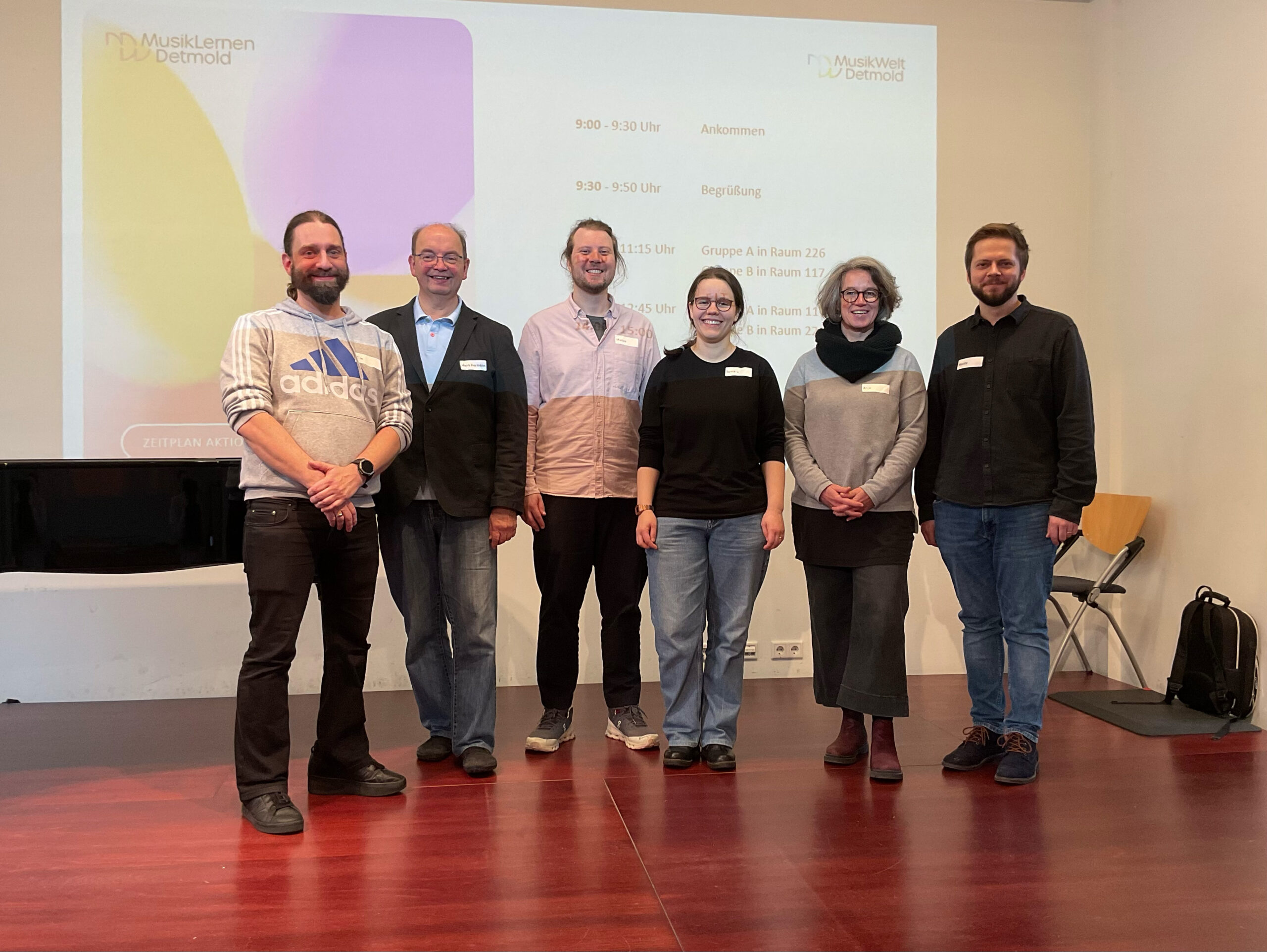Erlebten mit den Kindern und Jugendlichen einen spannenden ersten „Aktionstag Musik“: Das Projektteam der Johannes-Brahms-Musikschule und der HfM Detmold mit (von links) Tim Edler, Hans Hermann Jansen, Marius Strootmann (Lehrkräfte JBM), Tamara Thiel, Anja Damianov (wissenschaftliche Hilfskraft und Dozentin HfM Detmold) und Moritz Reuter (Projektkoordinator und Stellvertretende Leitung JBM). Foto: Stadt Detmold