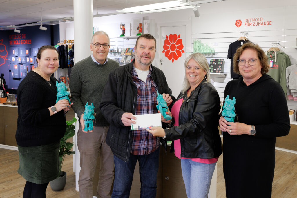 Bei der Vorstellung des Namens Hermannix in der Tourist Information Lippe & Detmold: (von links) Stefanie Hütte (Landesverband Lippe), Christian Schmidt (Vorsitzender der Werbegemeinschaft „Die Händler“), Gewinner Axel Radons, Vanessa Rubart (Teamleiterin der Tourist Information Lippe & Detmold) und Martina Wenke (Mitarbeiterin der Tourist Information Lippe & Detmold). Nicht im Bild: Ramona Roggenbuck, die ebenfalls zu den Gewinnerinnen des Namenswettbewerbs zählt. Foto: Stadt Detmold