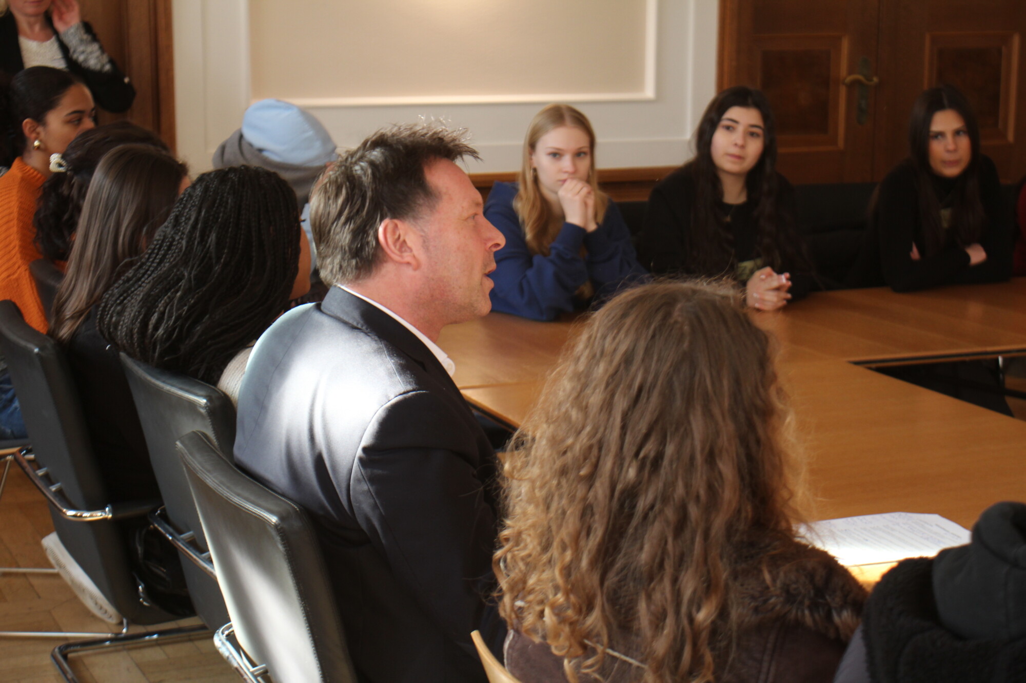 Engagiert in der Diskussion: Bürgermeister Frank Hilker mit Schülerinnen und Schülern aus Hasselt und Detmold. (Foto: Stadt Detmold)