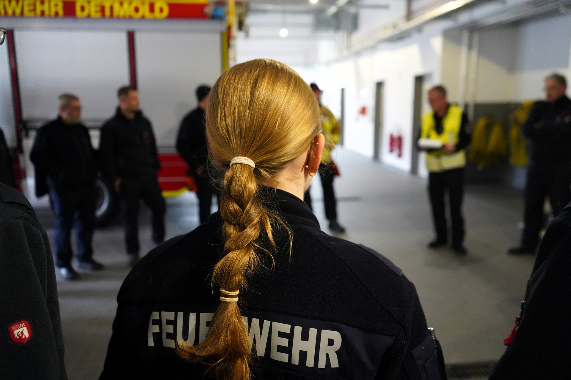 Wenige Minuten nach der Alarmierung: Die Einsatzleitung der Wache Nord instruiert die Feuerwehrkameradinnen und -kameraden über das weitere Vorgehen