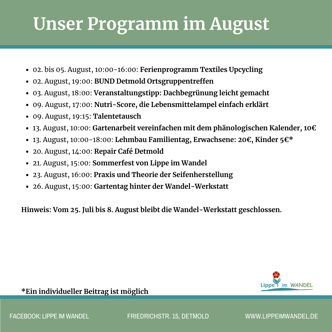 Wir von Lippe im Wandel haben uns wieder ein abwechslungsreiches Juli-Programm rund um das Thema Resilienz und Klimafolgeanpassung überlegt. Weitere Details zu den Veranstaltungen und die E-Mailadressen für die Anmeldung findet Ihr hier auf unserer Website.