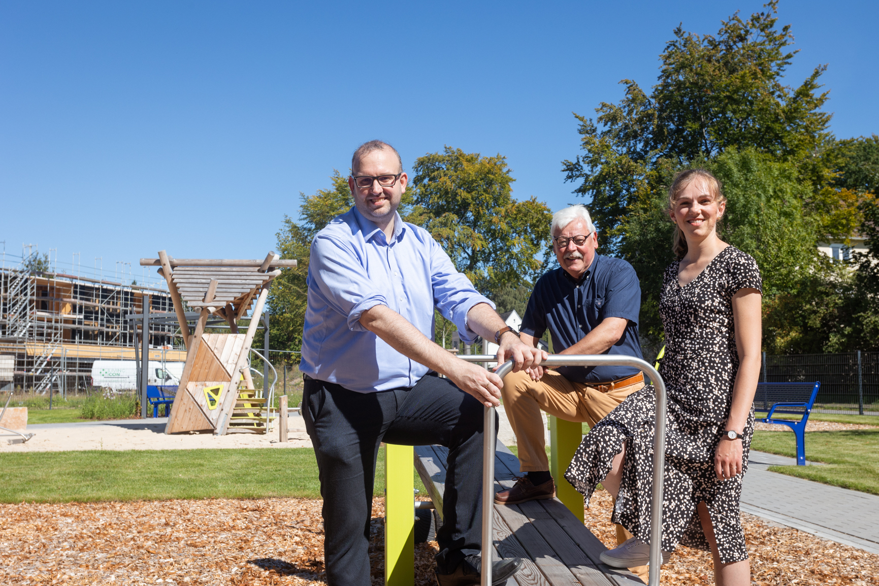 Unser Foto zeigt Martin Kölczer (Stadt Detmold, Fachbereichsleitung Stadtentwicklung) Erhard Friesenhan (Ortsbürgermeister Detmold-Nord) und Dorothee Lehmeier (Stadt Detmold, Freiraumplanung) auf dem neuen Spielplatz.