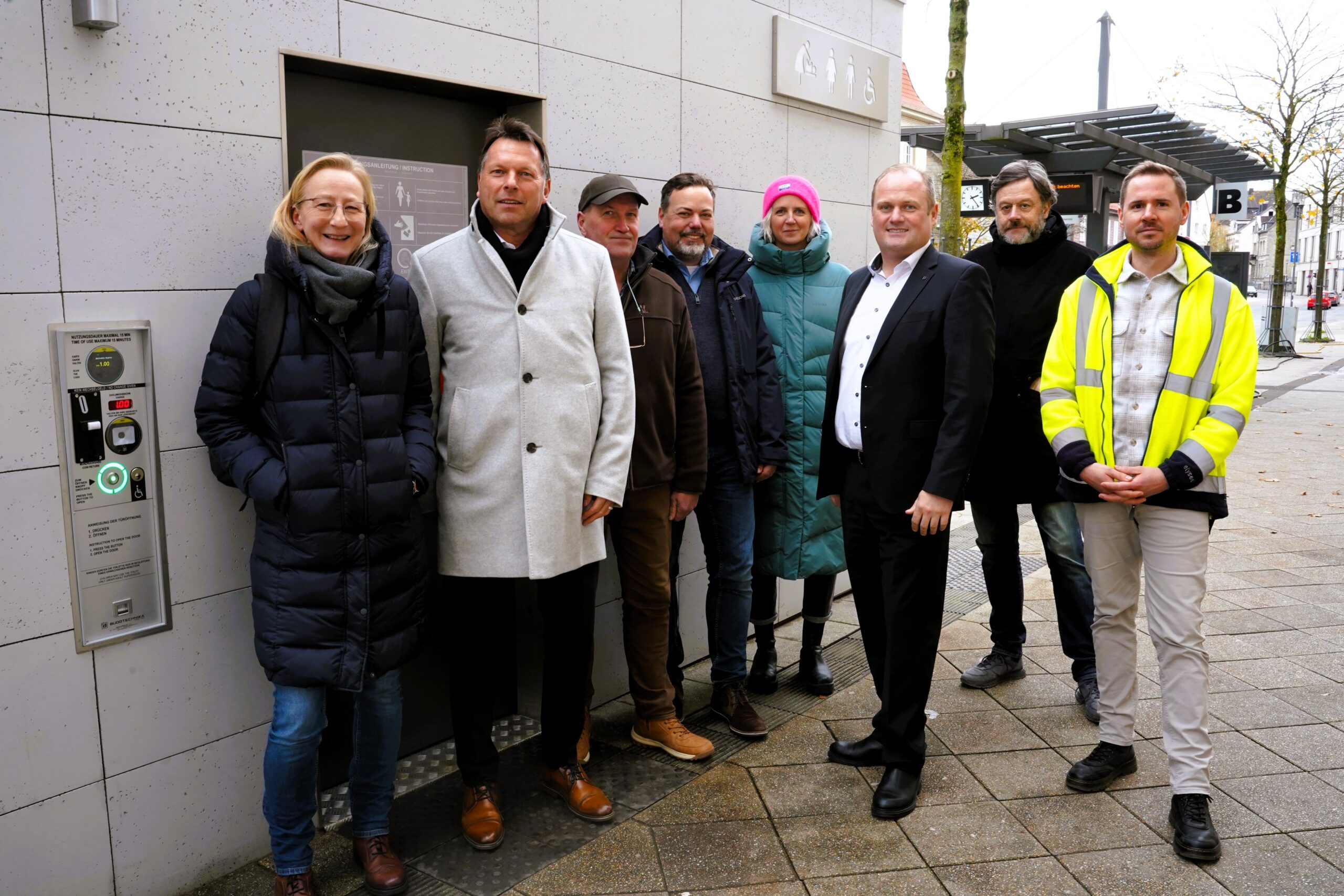 Bildunterzeile: Am Freitag, 21. November, 6 Uhr, öffnet die neue, barrierefreie Toilettenanlage im Rosental. Bürgermeister Frank Hilker hat bei einem Pressetermin jetzt einen erst Blick ins Innere freigegeben. Das Foto zeigt (von links) Andrea Winterberg (Fachbereich Tiefbau), Bürgermeister Frank Hilker, Uwe Lamm (Immobilienmanagement), Sebastian Brinkmann (Abteilungsleiter Hochbau), Corinna Rox (Leiterin des Fachbereichs Kultur, Tourismus, Marketing), Paul Kirchgässner (Werbegemeinschaft „Die Händler“), Hans Müller-Hisje (Detmolder Stadthallen GmbH) und Dennis Neubauer (Team Tiefbauplanung). Foto: Stadt Detmold