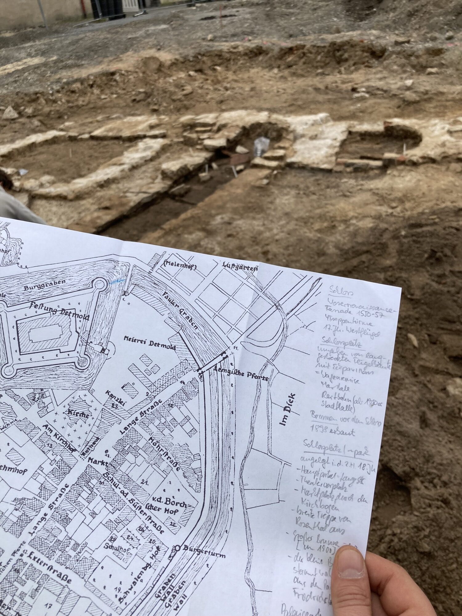 Bei den Aushubarbeiten für den Einbau einer großen Zisterne in der südöstlichen Ecke des Platzes vor dem Kanzleigebäude hat der Bagger Fundamente und aufgehendes Mauerwerk freigelegt. Dr. Elke Treude, Bodendenkmalpflegerin am Lippischen Landesmuseum, und Phillip Robinson, Leiter des Grabungsteams der Firma EggensteinExca, schätzen nach erster Anschauung, dass die Mauern im späten 17. Jahrhundert entstanden sind.