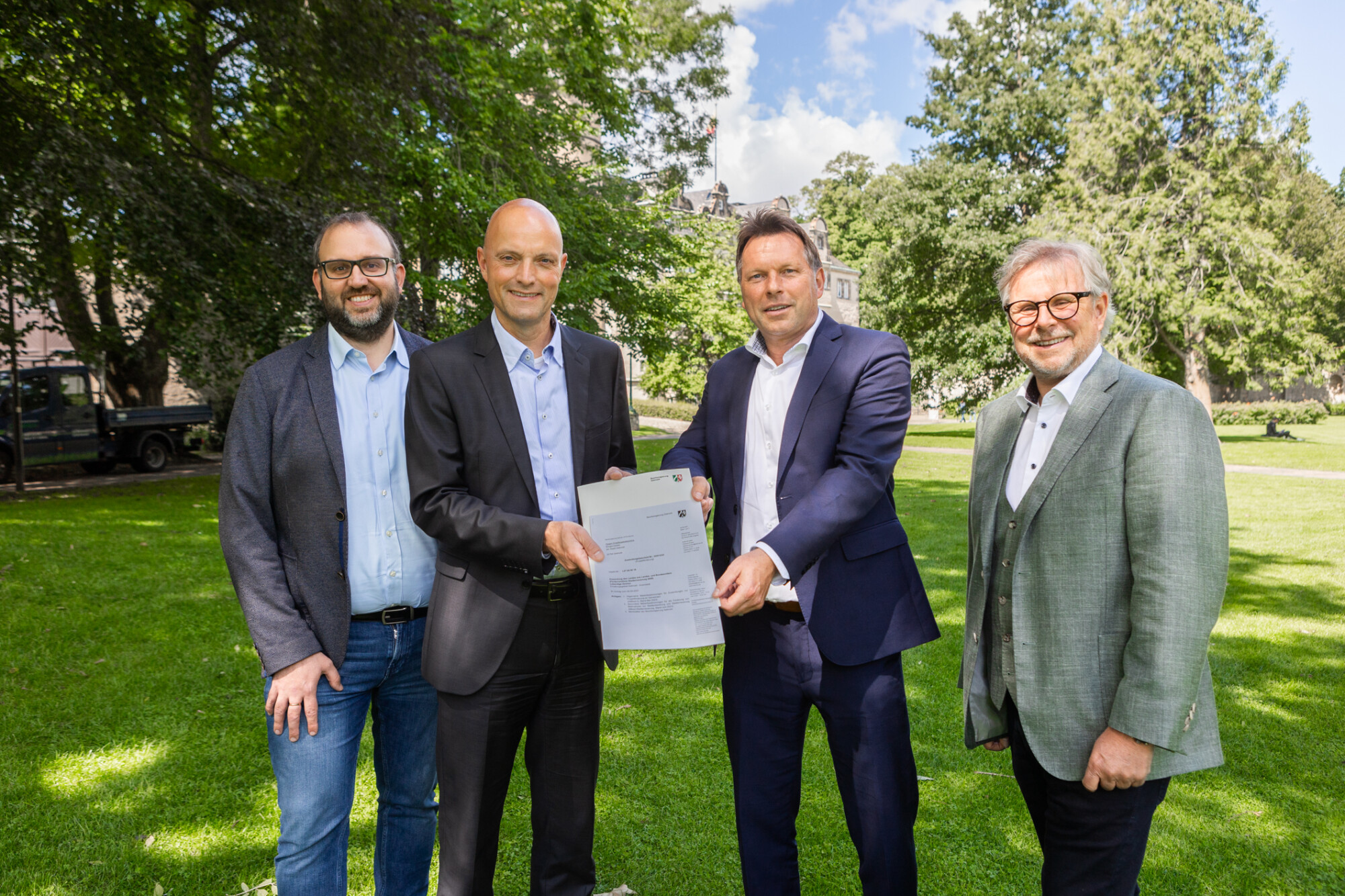 Eine der größtes Einzelförderungen des Jahres aus dem Städtebauförderprogramm „Lebendige Zentren“ ging in dieser Woche nach Detmold. Das Foto zeigt die Übergabe des Förderbescheids mit (von links) Martin Kölczer (Leiter des Fachbereichs 6 Stadtentwicklung bei der Stadt Detmold), Jens Kronsbein (Leiter der Abteilung für Regionale Entwicklung bei der Bezirksregierung Detmold), Bürgermeister Frank Hilker und Thomas Lammering, Technischer Beigeordneter der Stadt Detmold. (Foto: Stadt Detmold)