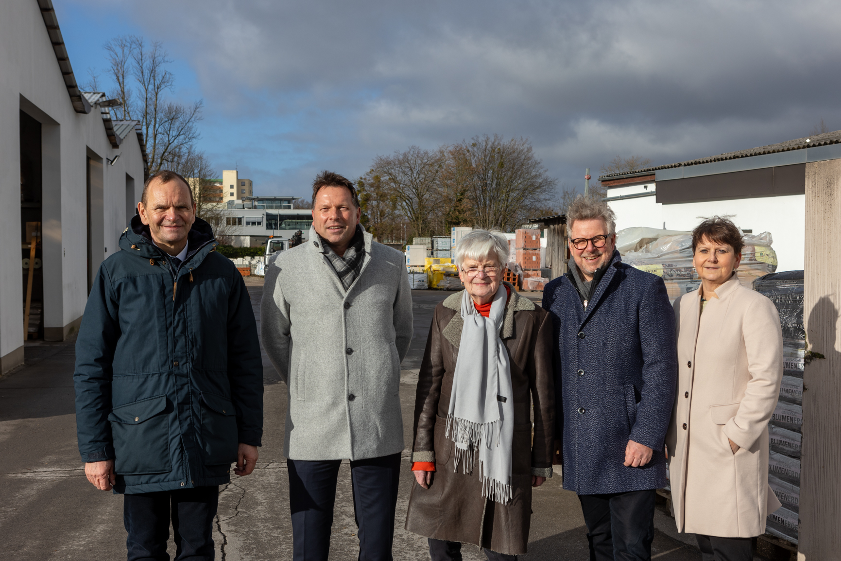 Dort, wo jetzt noch Baustoffe verkauft werden, soll künftig Deutschlands erstes „Zentrum für Nachhaltiges und Digitales Bauen“ entstehen. Das Foto zeigt (von links) Professor Dr. Jürgen Krahl (Präsident der TH OWL), Bürgermeister Frank Hilker, Margret Berkemann, Thomas Lammering (Technischer Beigeordneter der Stadt Detmold) und die Kanzlerin der TH OWL, Nicole Soltwedel. Foto (c) Stadt Detmold