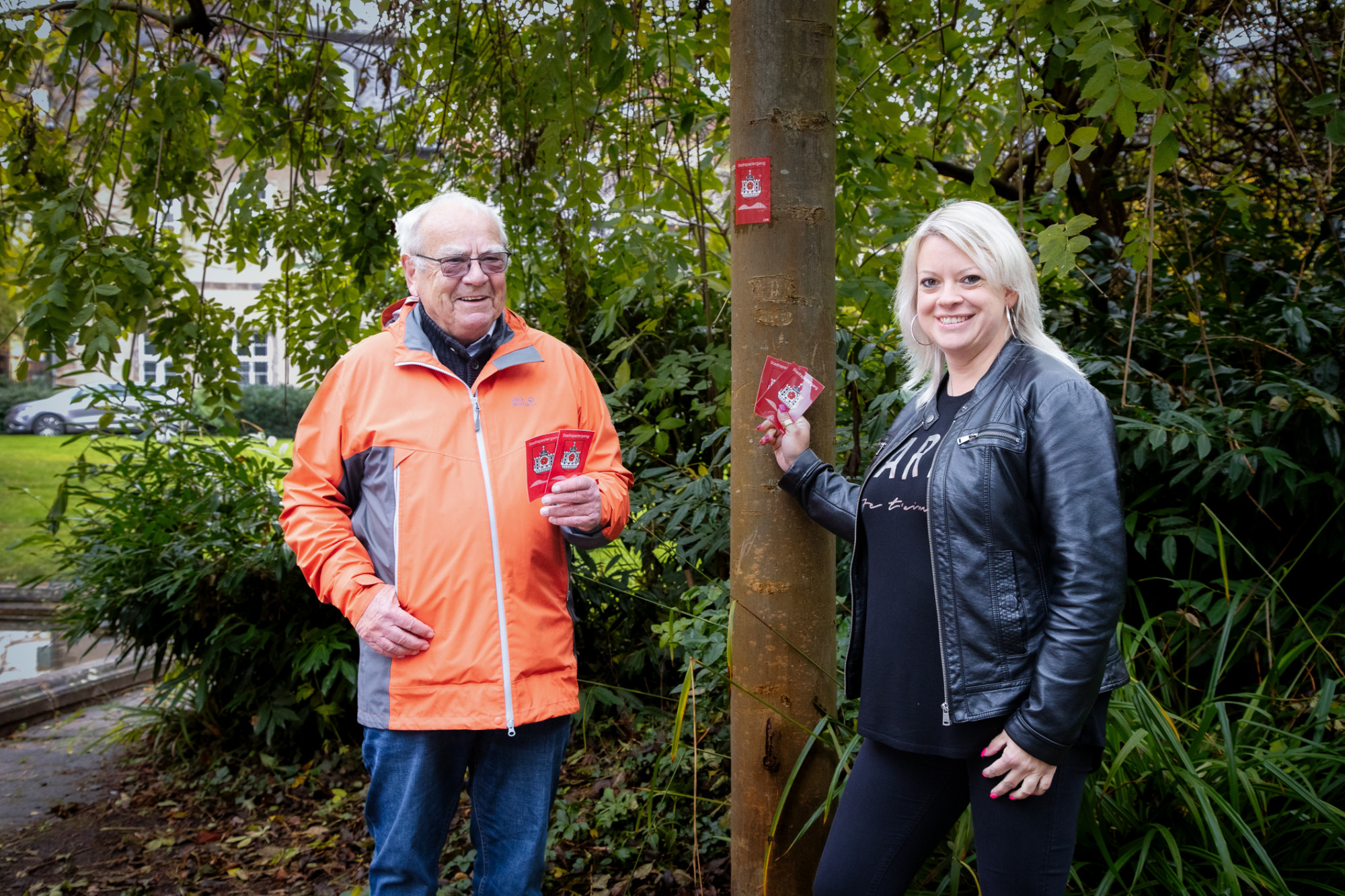 Das Foto zeigt den Wandern-Experten Adolf Nagel und von der Tourist Information Lippe & Detmold Vanessa Rubart mit den neuen Wandern-Markierungen. (c) Stadt Detmold