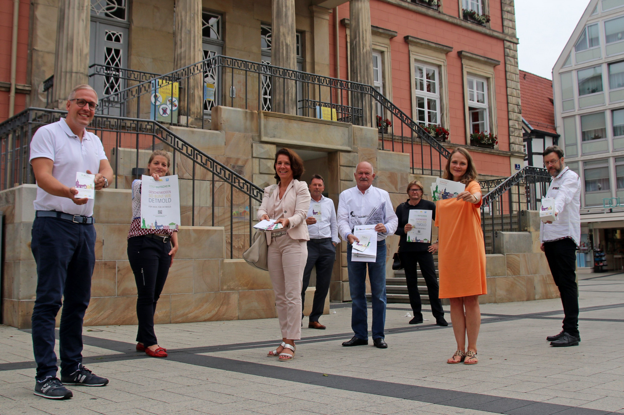 Auf dem Foto sehen Sie v.l.n.r.: Christian Schmidt (Vorsitzender des Arbeitskreises Innenstadtmarketing), Dörte Pieper (Fachbereichsleiterin Kultur, Tourismus, Marketing und Bildungseinrichtungen der Stadt Detmold), Eva-Susanne Ellminger (Stadtwerke Detmold GmbH), Frank Hilker (Kämmerer und 1. Beigeordneter der Stadt Detmold), Heinz Holey (Vorsitzender des Werbegemeinschaft Detmold e.V.), Günter Weigel (Lippe Tourismus & Marketing GmbH), Verena Haase (Mediengestaltung Stadt Detmold) und Hans Müller-Hisje (Projektleitung Stadtmarketing der Stadt Detmold)
