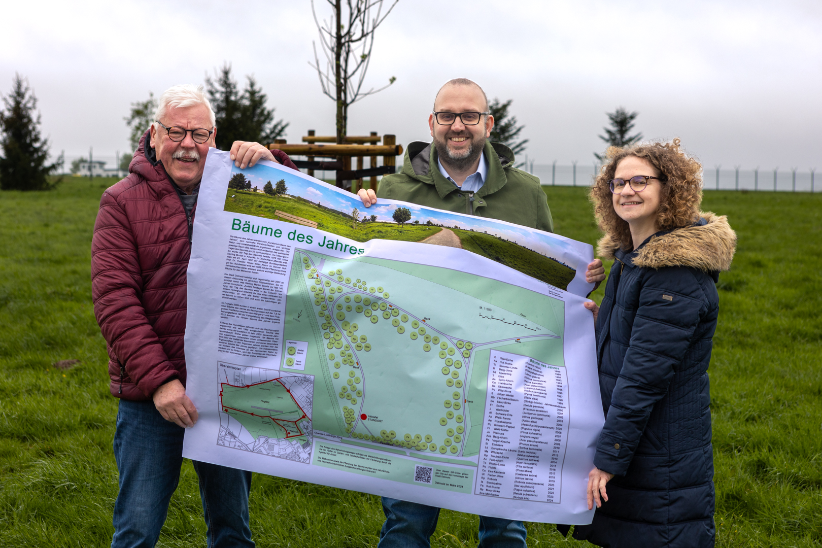 Foto: Ortsbürgermeister Erhard Friesenhan, Fachbereichsleiter Martin Kölczer und Landschaftsarchitektin Inga Müller (v.li.) freuen sich, dass der Baumlehrpfad um eine weitere Bauart ergänzt werden konnte.