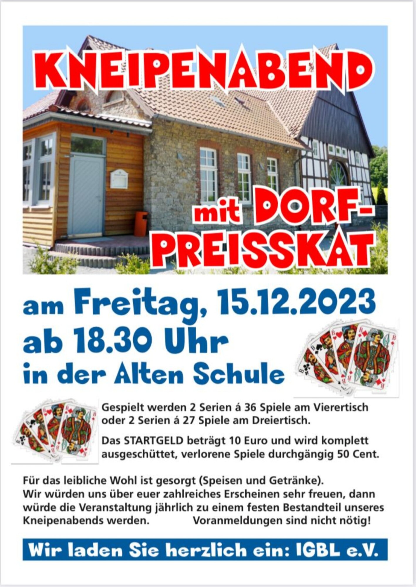 Der Kneipenabend mit Dorf-Preisskat der Interessengemeinschaft Bentrup-Loßbruch e.V. findet am Freitag, 15.12.2023 ab 18:30 im Dorfgemeinschaftshaus Alte Schule in Bentrup statt.