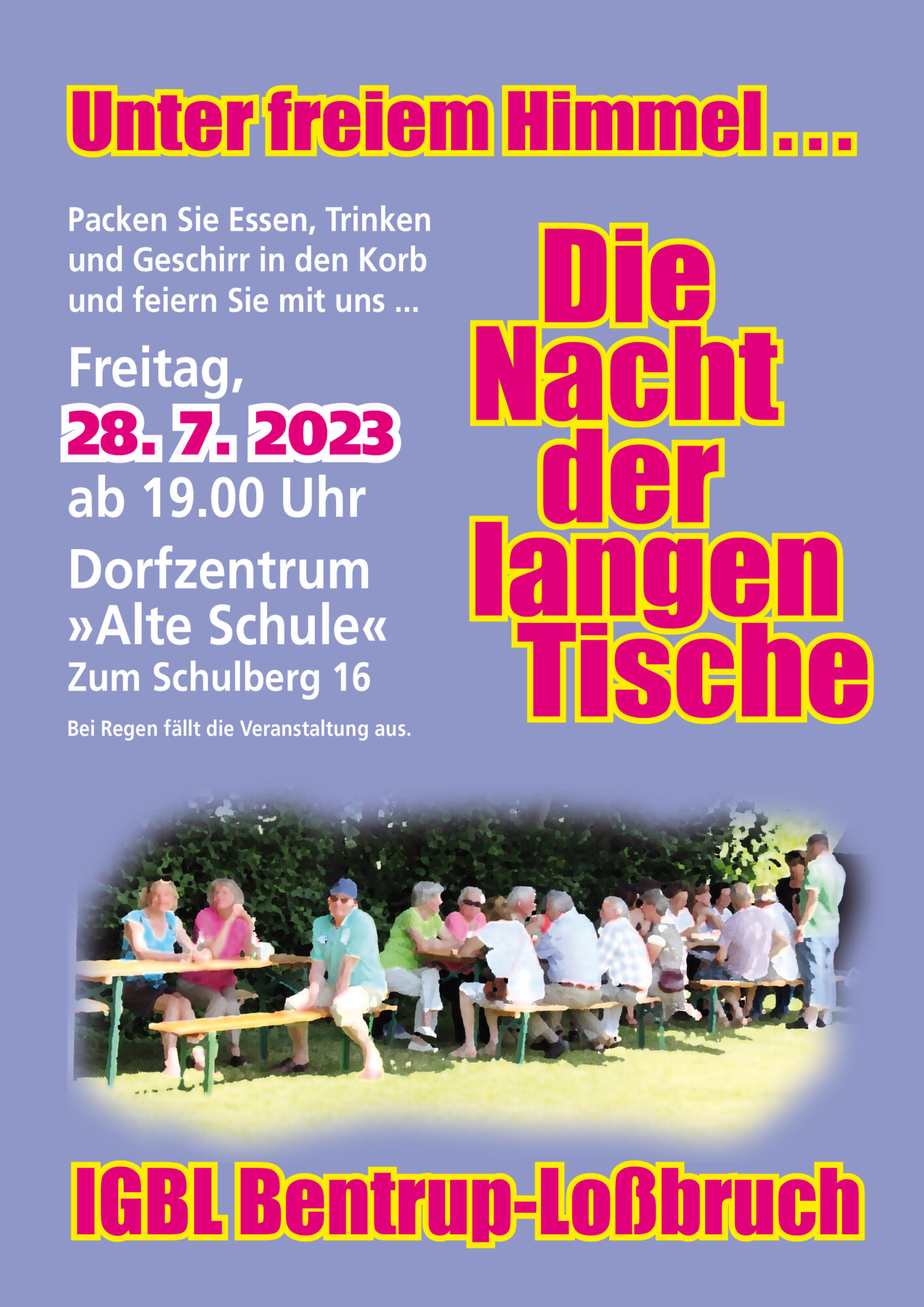 Die Interessengemeinschaft Bentrup-Loßbruch e.V. lädt zur Nacht der langen Tische am Dorfgemeinschaftshaus Alte Schule in Bentrup ein.