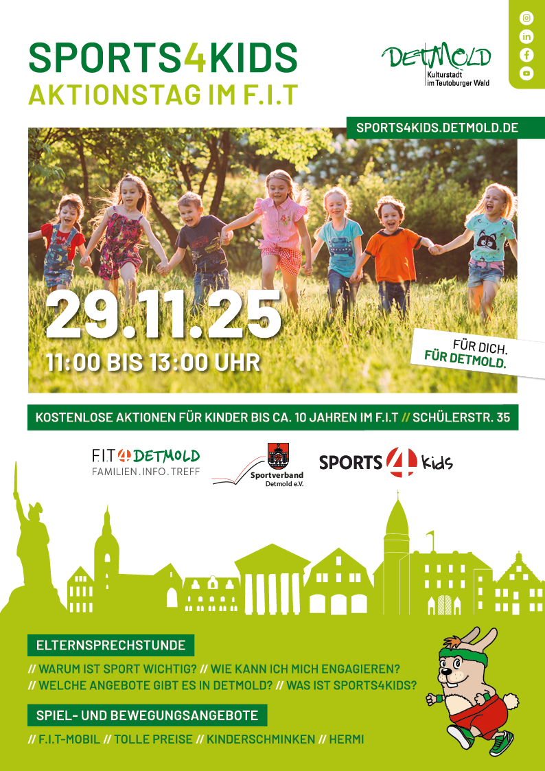 Zu einem Sport4Kids-Aktionstag mit Hermi lädt die Stadt Detmold am Samstag, 29. November, von 11 bis 13 Uhr in den Familien-Info-Treff (F.I.T), Schülerstraße 35, ein. Besucherinnen und Besucher erwartet ein abwechslungsreiches Programm rund um das Thema Sport und Bewegung. Hier können Groß und Klein sich nicht nur über das Projekt Sports4Kids informieren, das seit 2018 allen Vierjährigen einen Gutschein für eine einjährige Mitgliedschaft in einem Sportverein bietet. Ob zum F.I.T-Mobil, zu inklusiven Bewegungsangeboten oder Sportmöglichkeiten im Allgemeinen – die Mitarbeitenden stehen gerne mit Rat und Tat zur Seite.
