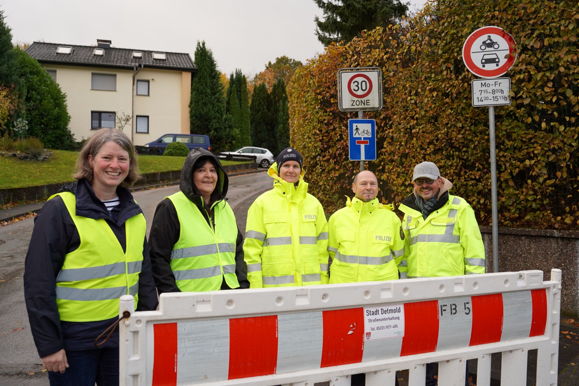 Verkehrsversuch 1: Sind mit dem Start des Verkehrsversuchs sehr zufrieden: (von links) Birgit Mattke und Marion Czychun (Schulleitung Kusselbergschule), Kerstin Heijenga und Lars Ridderbusch von der Kreispolizeibehörde Lippe sowie Andreas Raabe, Verkehrsexperte der Stadt Detmold. Foto: Stadt Detmold